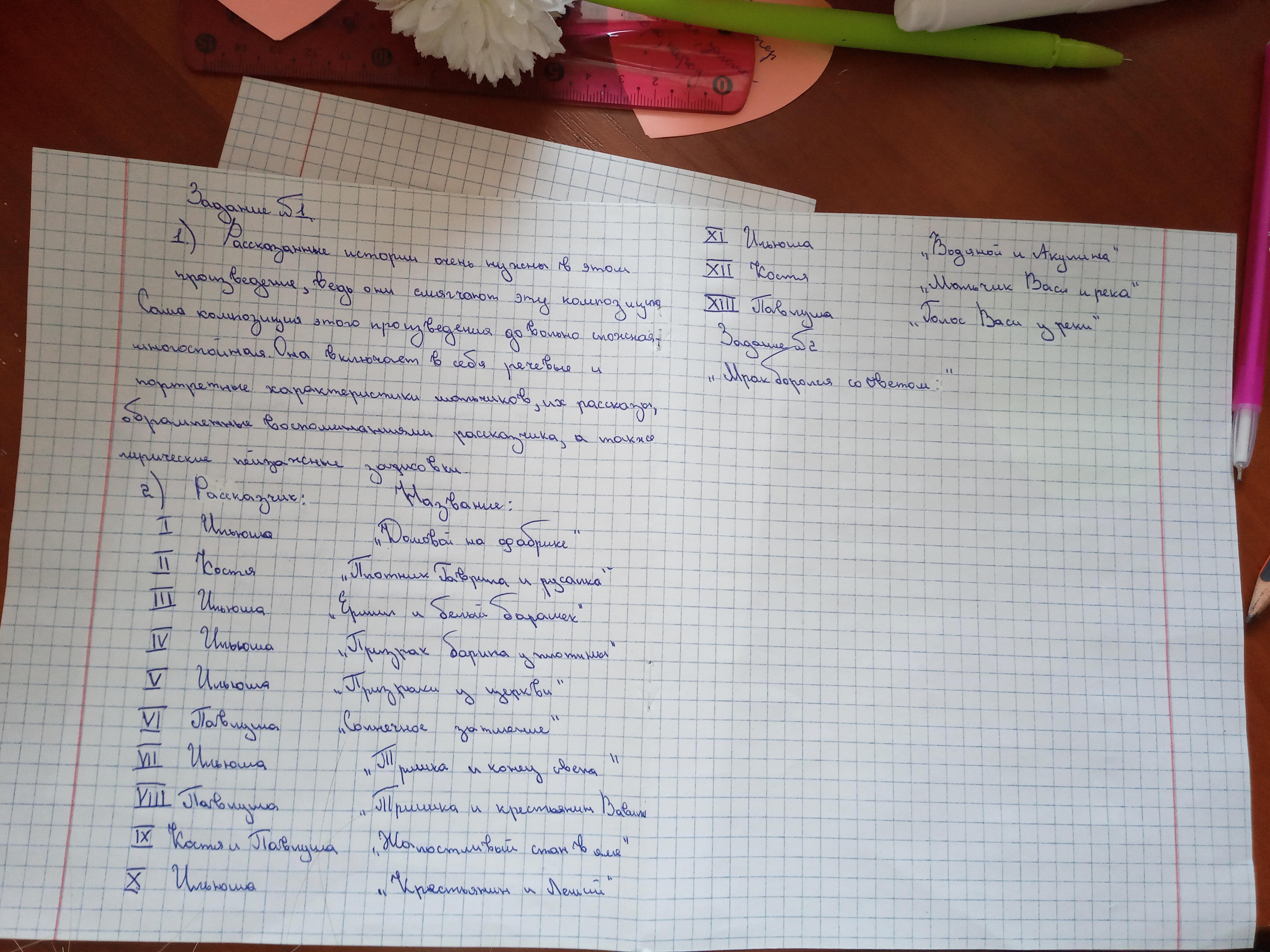 Ответ: Задание 1)Рассказанные истории очень нужны в этом произведении, ведь они смягчают эту композицию. Сама композиция этого произведения довольно сложная, многослойная. Она включает в себя речевые и портретнве характеристики мальчиков, их рассказы, окрашенные воспоминания рассказчика,а также лирические пейзажные зарисовки. Задание 1). 2 часть 1. Домовой на фабрике. 2. Плотник Гаврила и русалка 3. Ермил и белый барашек 4. Призрак барина у платины 5. Призраки у церкви 6. Небеснае предвиденье ( солнечное затмение ) 7. Тришка и конец света 8. Тришка и крестьянин Вавила 9. Жалостливый стон в яме 10. Крестьянин и Леший 11.Водяной и Акулина 12. Мальчик Вася и река 13. Голос Васи у реки