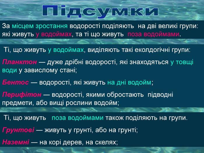 п'ять груп водоростей : евгленові, діатомові, бурі, червоні, зелені – є найпоширенішими та найвідомішими