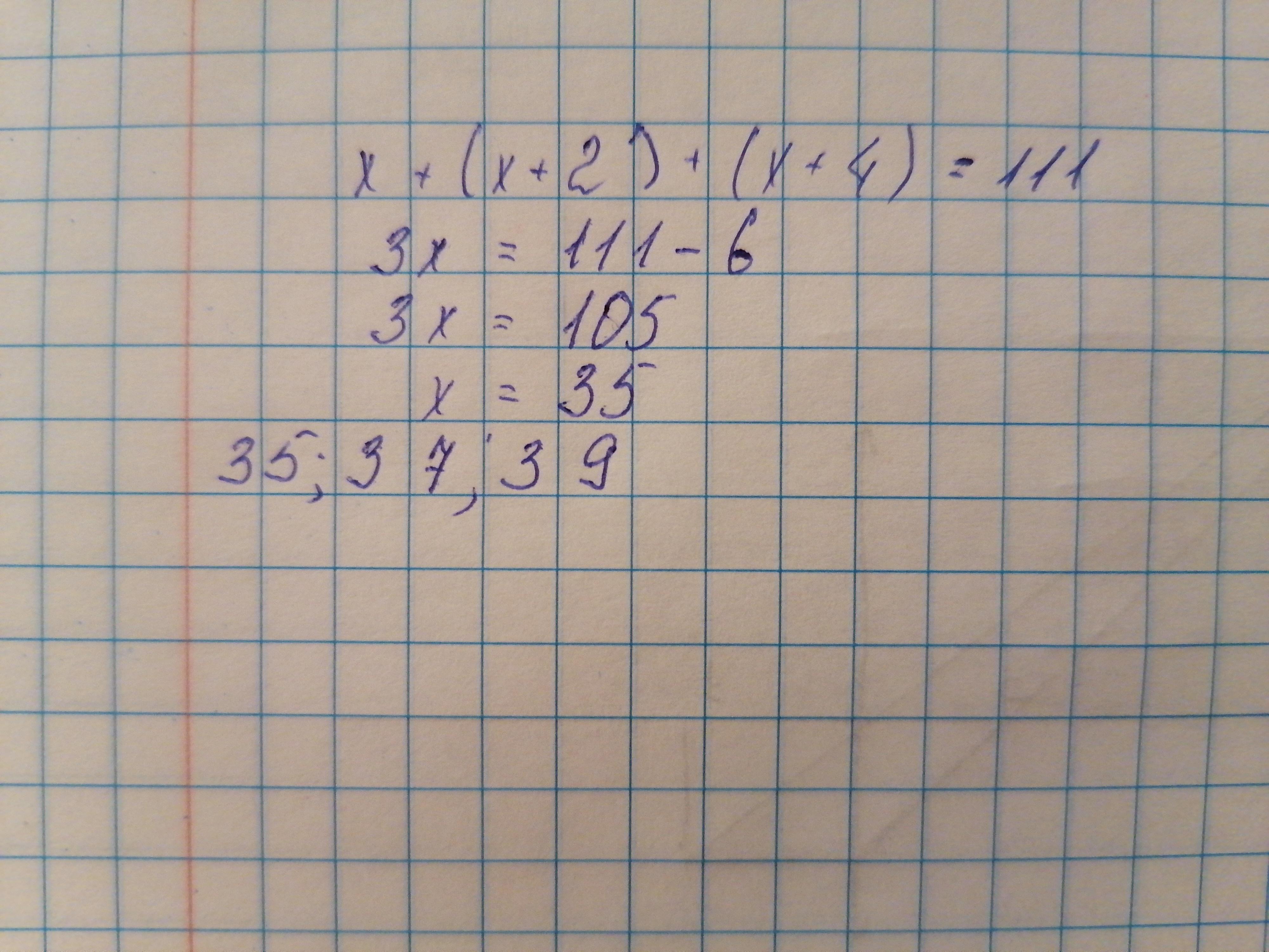 Пусть х - меньшее, из чисел, тогда второе - х+2, а третье - х+4. Сумма равна х+х+2+х+4=111