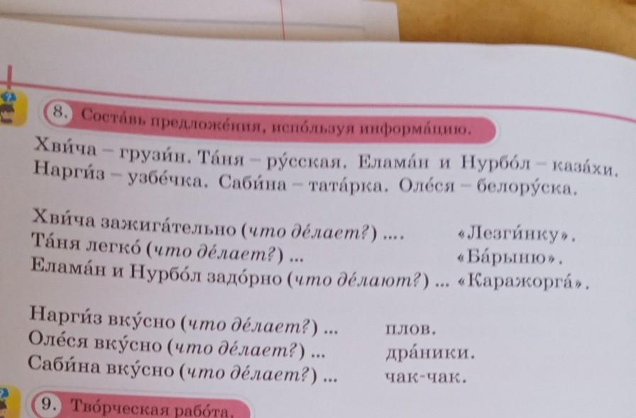 хвича зажигательно танцует лезгинку. таня легко танцует барыню. еламан и нурбол задорно танцуют каражорга. наргиз вкусно готовит плов. олеся вкусно готовит драники. сабина вкусно готовит чак-чак.