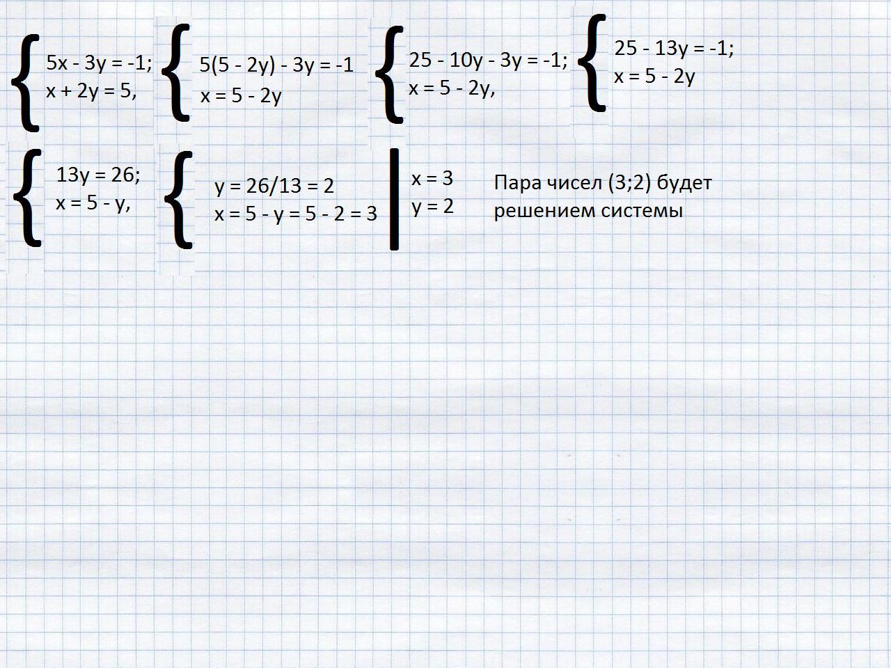 Решите систему уравнений способом подстановки 5х-3у=-1 х+2у=5. Мне нужно подробное пошаговое решение на тетради. P.s ответ (1;2).Даю много балов пожалуйста сделайте все грамотно.