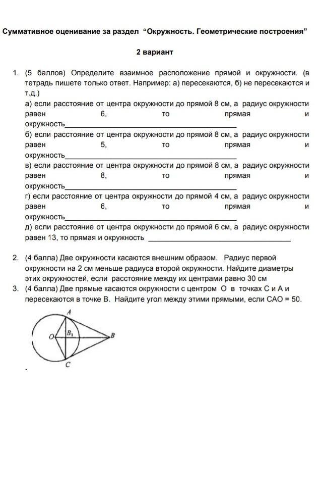 Определите взаимное расположение прямой и окружности. (в тетрадь пишете только ответ. Например: а) пересекаются, б) не пересекаются и т.д.) а) если расстояние от центра окружности до прямой 8 см, а радиус окружности равен 6, то прямая и окружность б) если расстояние от центра окружности до прямой 8 см, а радиус окружности равен 5, TO прямая и окружность в) если расстояние от центра окружности до прямой 8 см, а радиус окружности равен 8, TO прямая и окружность г) если расстояние от центра окружности до прямой 4 см, а радиус окружности равен 6, то прямая и окружность д) если расстояние от центра окружности до прямой 6 см, а радиус окружности равен 13, то прямая и окружность 2. (4 балла) Две окружности касаются внешним образом. Радиус первой окружности на 2 см меньше радиуса второй окружности. Найдите диаметры этих окружностей, если расстояние между их центрами равно 30 см 3. (4 балла) Две прямые касаются окружности с центром О в точках С и А и пересекаются в точке В. Найдите угол между этими прямыми, если