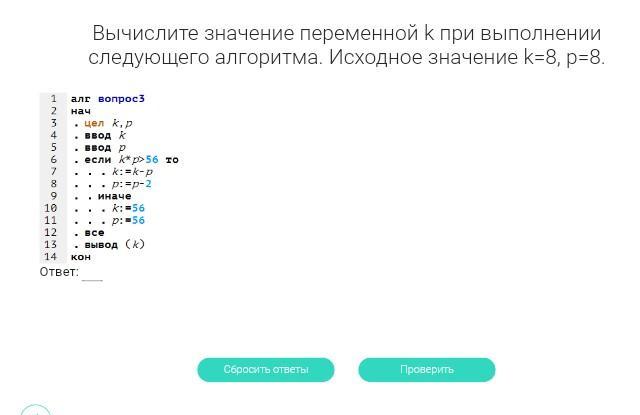 Вычислите значение при переменной k при выполнении следующего алгоритма. Исходное значение k=8, p=8
