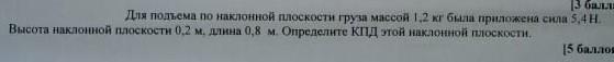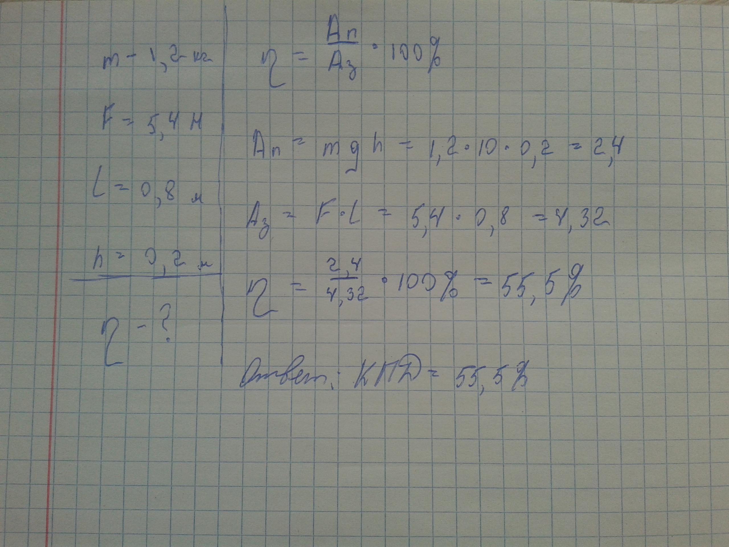 для подъёма по наклонной стены груза массой 1,2 кг была приложена сила 5,4 в склонности 0,2 м длина 0,8 м определите КПД этой наклонности плоскости