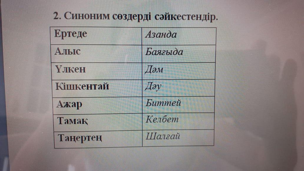 2)Ертеде-баяғыда.Алыс-шалғай.Үлкен-дәу.Кішкентай-биттей.Ажар-келбет.Тамақ-дәм.Таңертең-азанда.