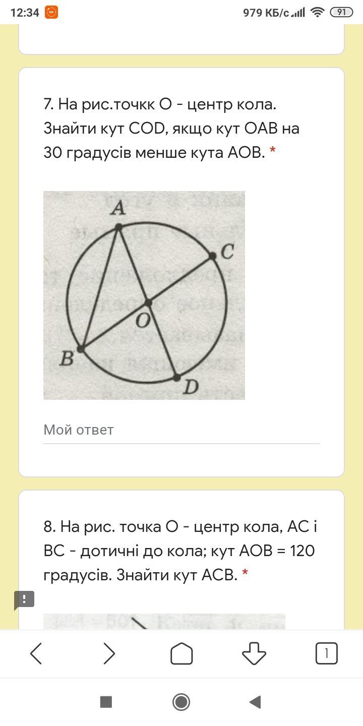 На рис.точкк О - центр кола. Знайти кут СОD, якщо кут ОАВ на 30 градусів менше кута АОВ.