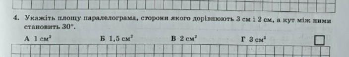 СРОЧНО!!! укажіть площу паралелограма сторони якого дорівнюють 3 см і 2 см а кут між ними становить 30