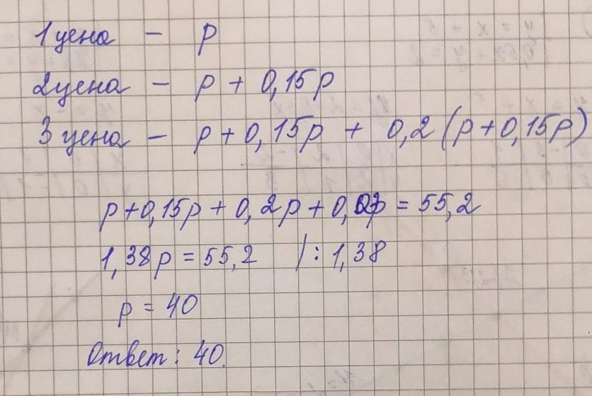 Цену на товар, сначала повысили на 15%, а за тем повысили на 20%. В результате товар стал стоять 55,2 грн. Какова была первоначальная цена товара?