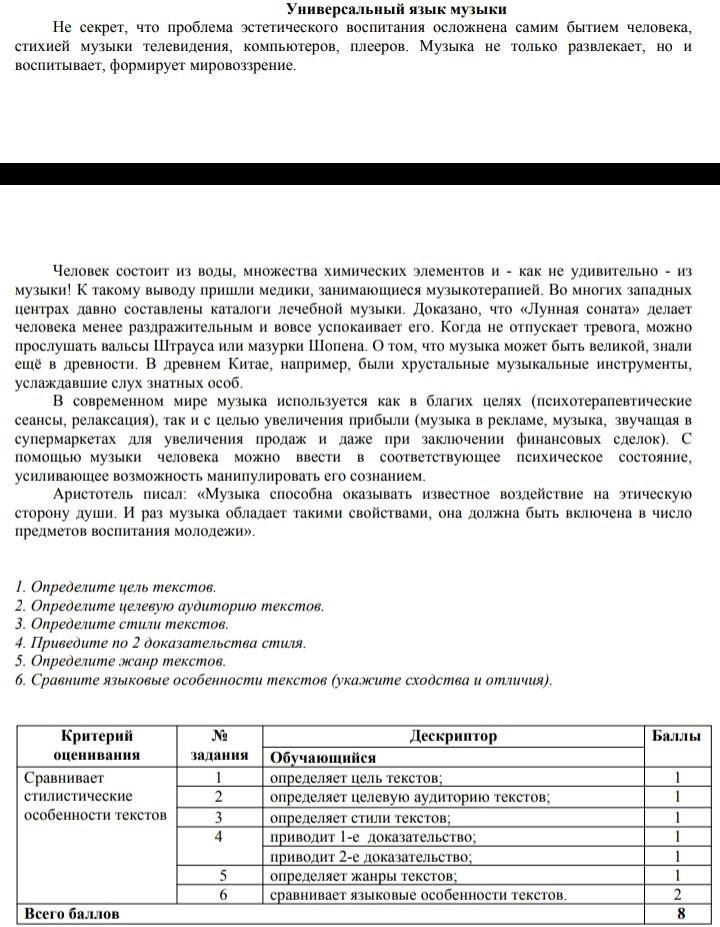 1. Цель первого текста : рассказать читателю о том, что музыка может изменить человека в лучшую сторону