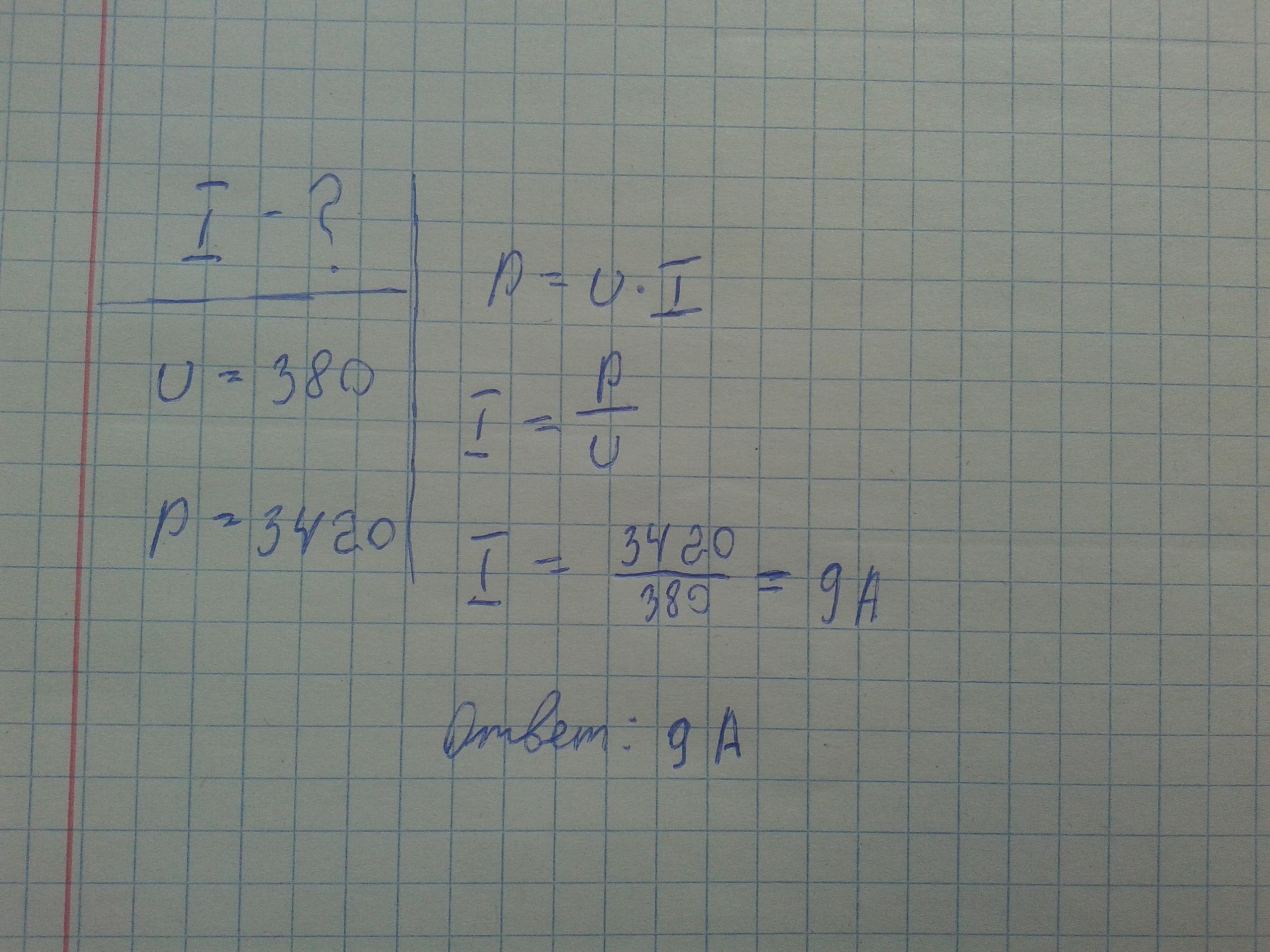 Визначте силу струму в об'єктив двигуна ліфта, якщо він розвиває потужність 3420Вт, напруга на зупинках двигуна 380В