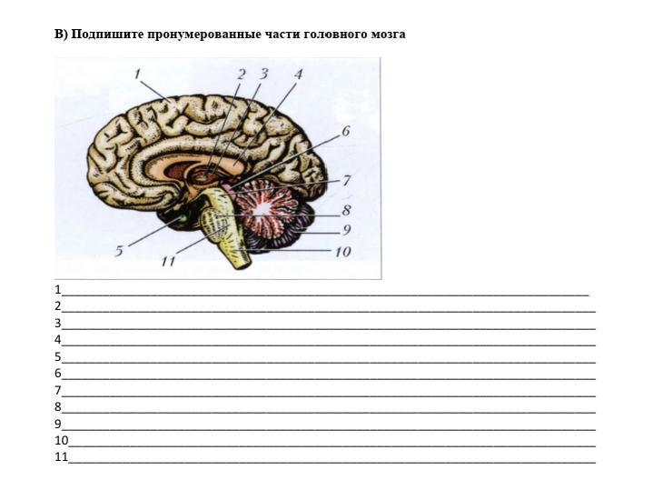Подпишите пронумерованные части головного мозга (там их 11)