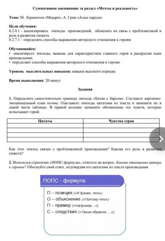 Сор по литературе 8 класс 4 четверть раздел Мцыри