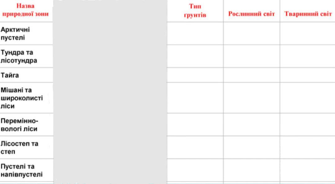 Таблиця природні зони грунти, які їм відповідають, тваринний і рослинний світм (я прикрипила таблицю)