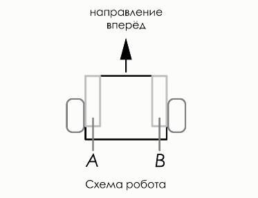 Робот оснащён двумя отдельно управляемыми колёсами, радиус каждого из колёс робота равен 10 см. Левым колесом управляет мотор А, правым колесом управляет мотор В. Колёса напрямую подсоединены к моторам (см. схему робота).