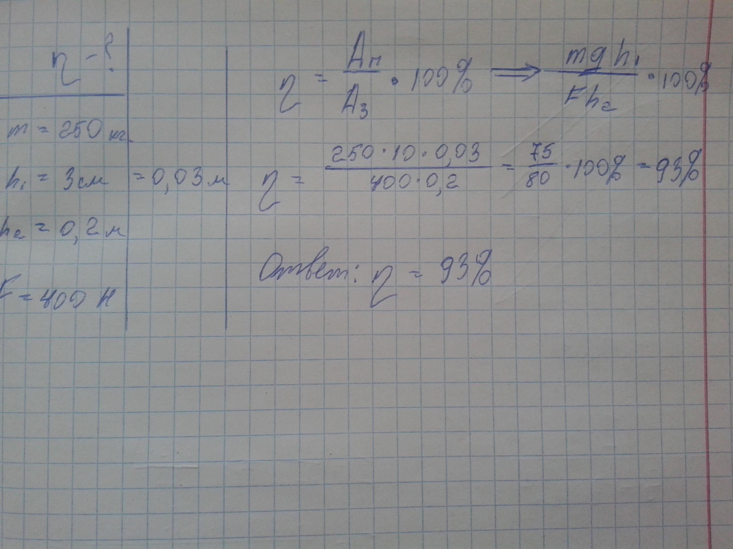 Вычеслите КПД рычага, с помощью которого груз массой 250 кг равномерно подняли на высоту 3 см, при этом к длинному плечу рычага была приложена сила 400 Н, а точка приложения силы опустилась на 0,2 м.