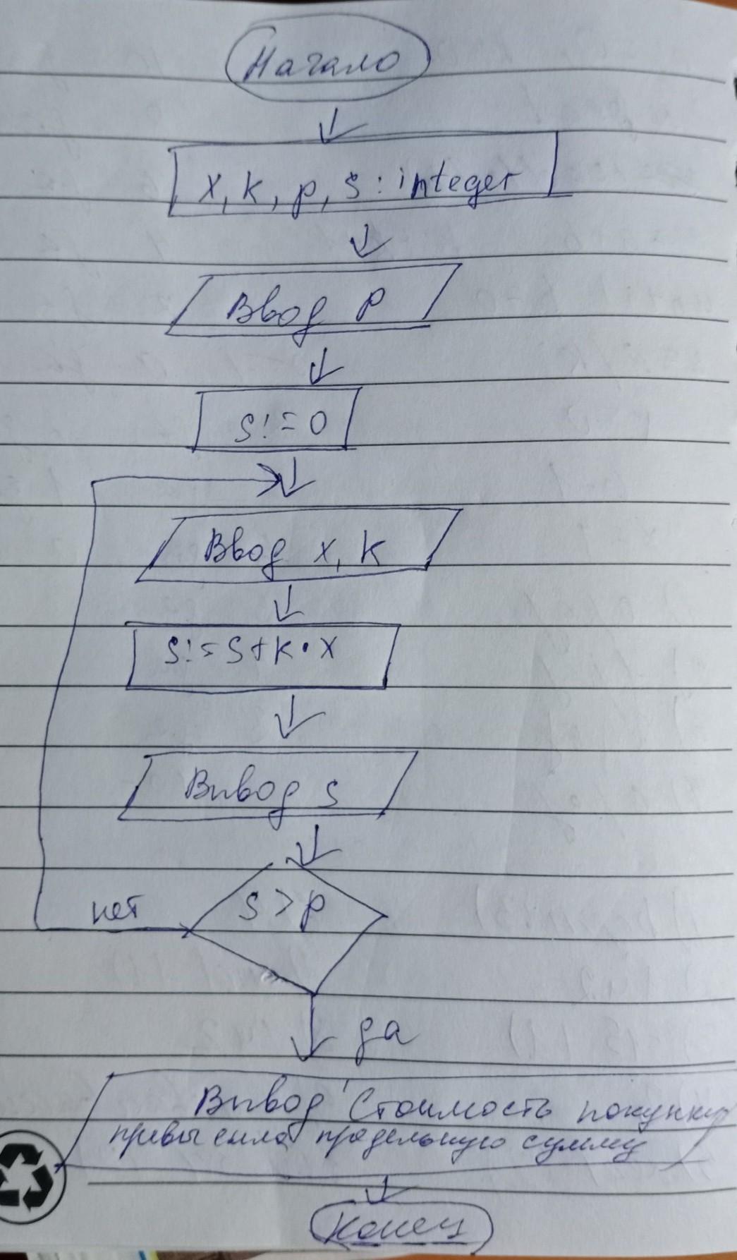 Обозначим через x и k цену и количество товара, через p - заданную предельную сумму, через s - стоимость покупки.