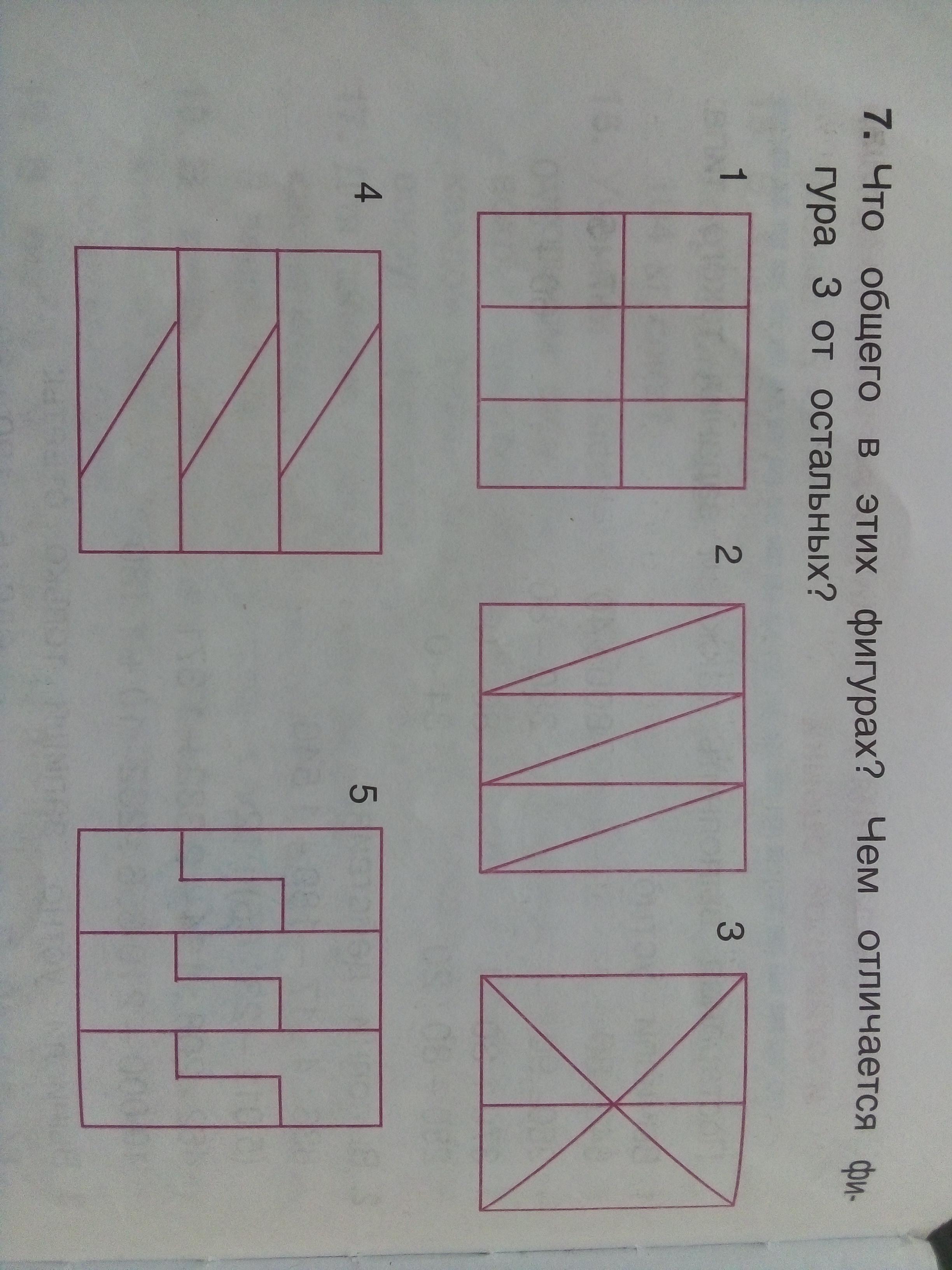они все разделены на 6 частей, есть острые углы и угол с 90 градусом, одна общая фигура-квадрат. Рисунок 3 отличается тем что он разделен 6-ю треугольниками-равносторонними