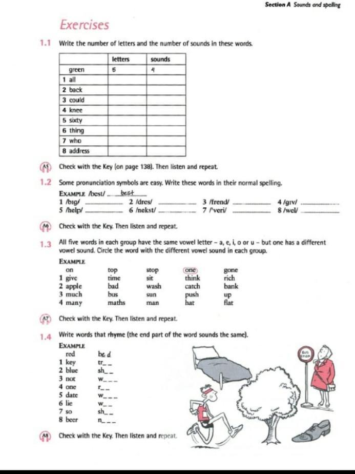 1.4 1- tree ; 2- shoe; 3- want ; 4- run ; 5- wait ;6- why ; 7- show ; 8- near