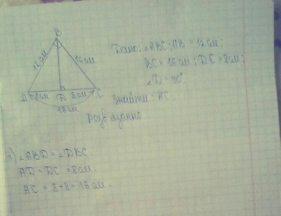 BD - бісектриса трикутника ABC, AB = 12 см, BC = 16 см. Більший відрізок, на які бісектриса BD ділить сторонуAC, дорівнює 8 см. Знайдіть AC.