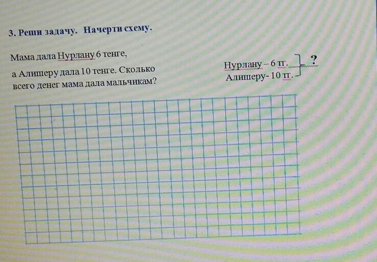 мама дала Нурлану 6 тенге,а Алишеру дала 10 тенге.Сколько всего денег мама дала мальчикам