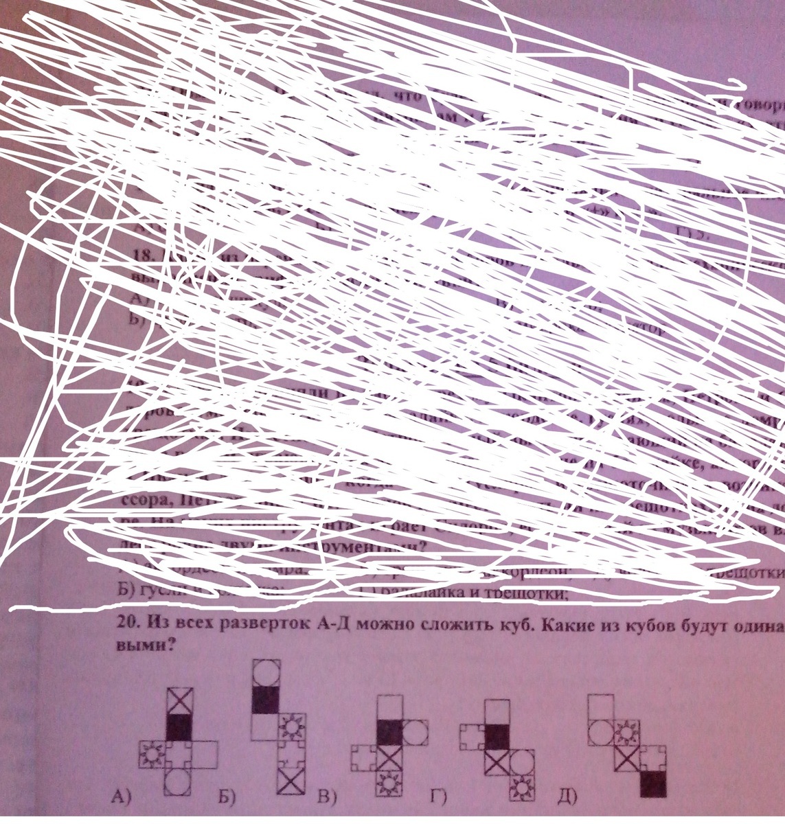 Из всех развёрток (см. рис) А-Д можно сложить куб.Какие из кубов будут оденаковыми? прошу помогите!!!