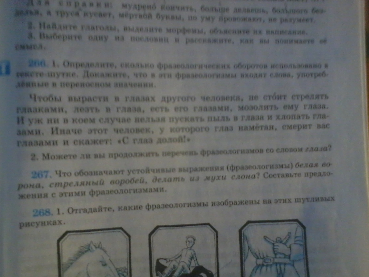 1. Определите, сколько фразеологических оборотов использовано в тексте-шутке.Докажите,что в эти фразеологизмы входят слова,употребленные в переносном значении. Чтобы вырасти в глазах другого человека,не стоит стрелять глазками,лезть в глаза,есть его глазами,мозолить ему глаза.И уж ни в коем случае нельзя пускать пыль в глаза и хлопать глазами.Иначе этот человек,у которого глаз наметан,смерит вас глазами и скажет "С глаз долой!" 2.Можете ли вы продолжить перечень фразеологизмов со словами глаза?