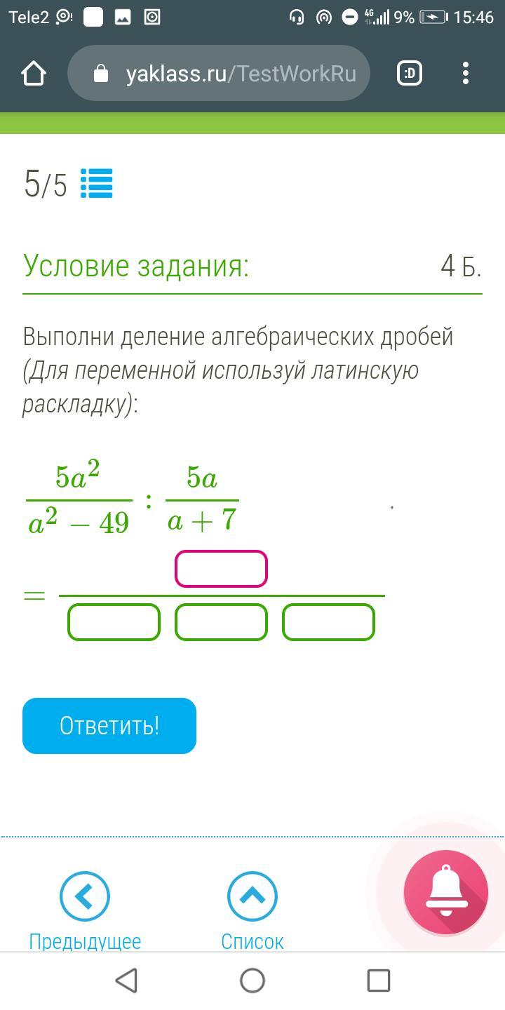 Выполни деление алгебраических дробей (Для переменной используй латинскую раскладку). Помогите пожалуйста от души за ранее