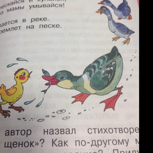 Утка пыталась воспитывать цыпленка хорошо но у нее это не получалось. Она воспитывала цыпленка плохо потому что она не знает как ухаживать за циплятами. Она кормила его рыбой, а цыплята рыбу не едят.