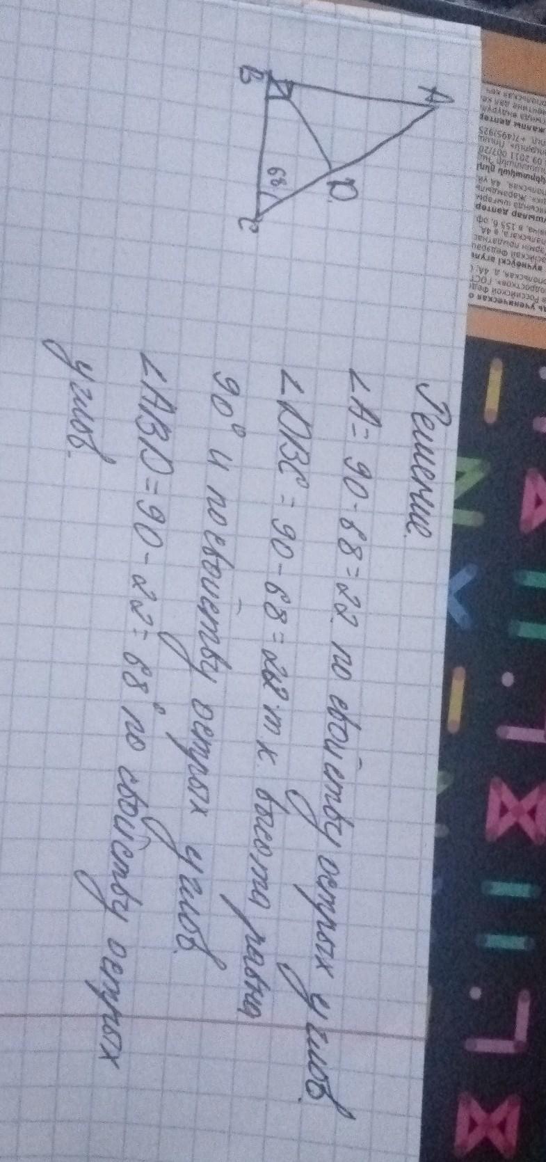 В прямоугольном треугольнике проведена высота к гипотенузе. Какие углы эта высота образует с катетами, если больший из острых углов этого треугольника равен 68°?