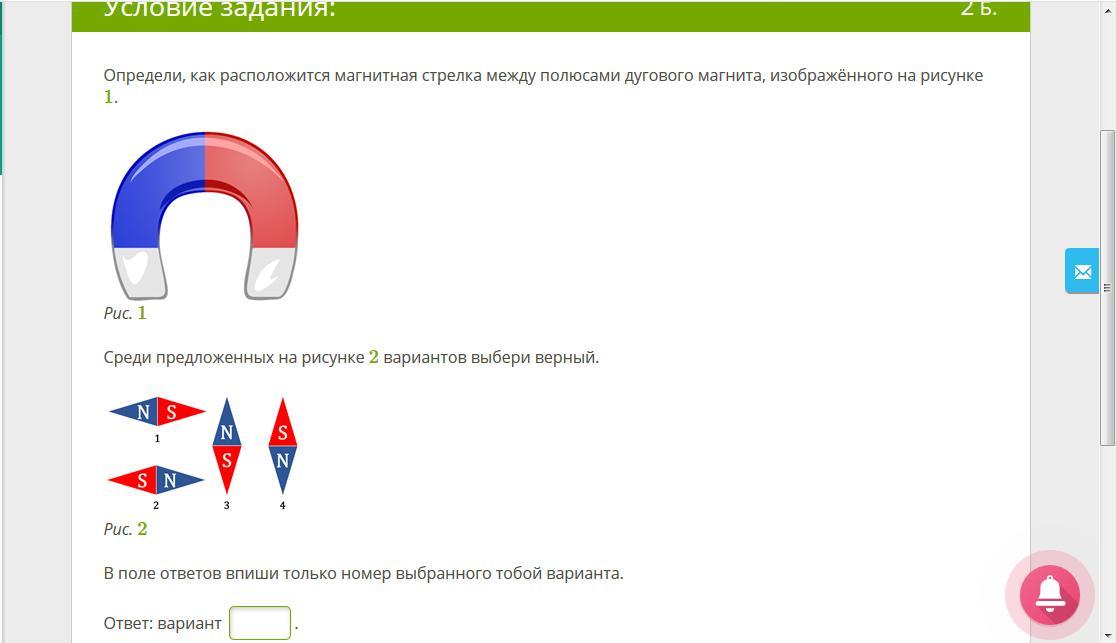 Определи, как расположится магнитная стрелка между полюсами дугового магнита, изображённого на рисунке 1.
