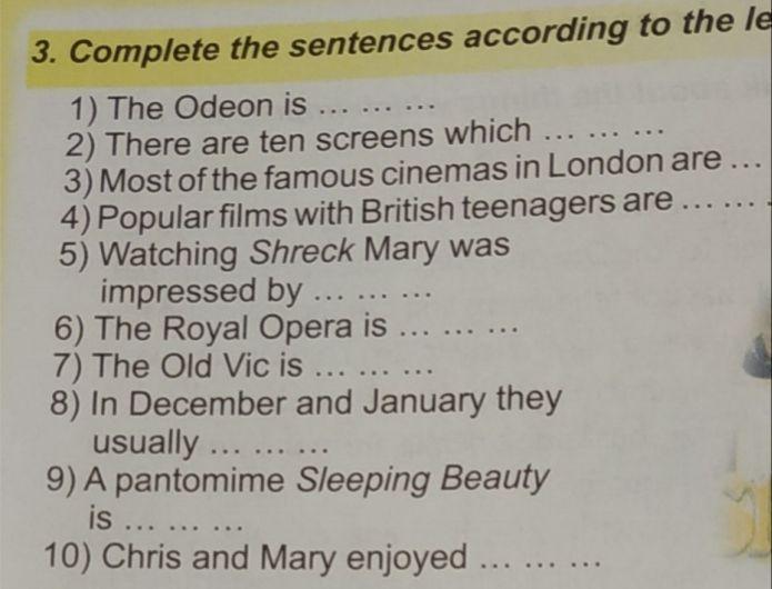 Dear Mum and Dad, This morning we went to the Zoo in Regent's Park, and we've just been to 'the Odeon', one of the biggest cinemas in London. It has got ten screens and can show around ten films three times a day. Tickets in London are very expensive but this cinema is popularwith celebrities'. Most of the famous large cinemas are in the area around Leicester l'lestə] Square. Popular films with British teenagers are cartoons (especially Disney), police films, westerns, adventure films and romantic films. We were watching Shrek'. I was impressed by computer special effects, which made everything look like real. Kisses, Mary