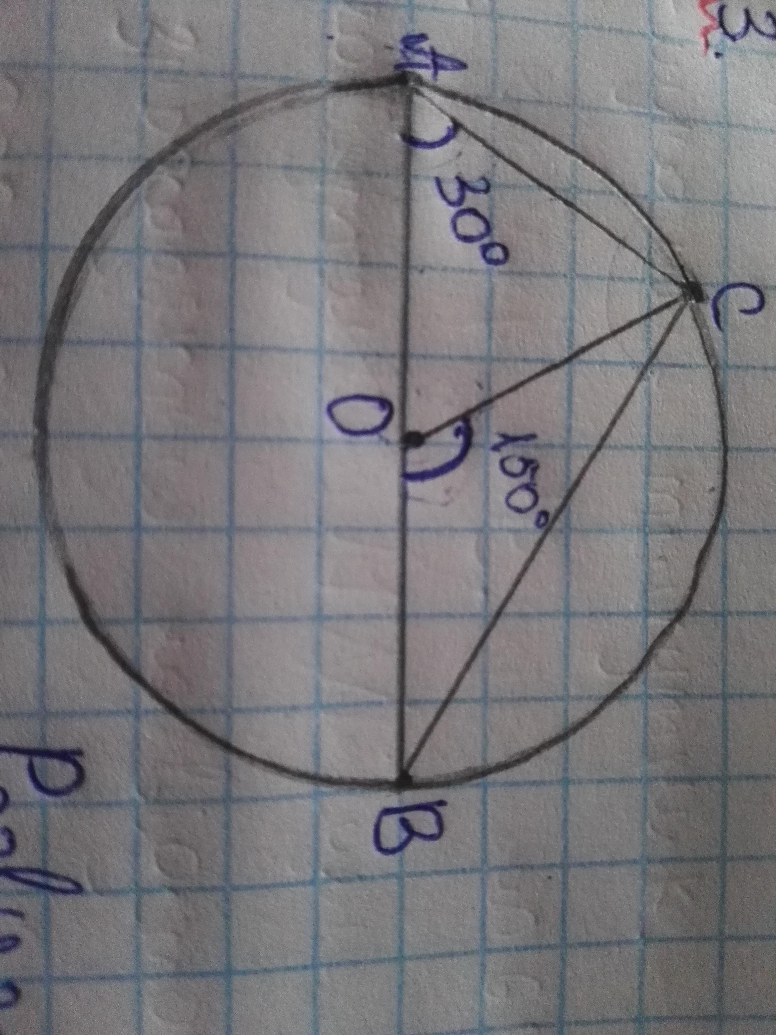 Знайти кути трикутника АВС якщо О—центр кола,АВ—діаметра кола, кут СОВ=150°