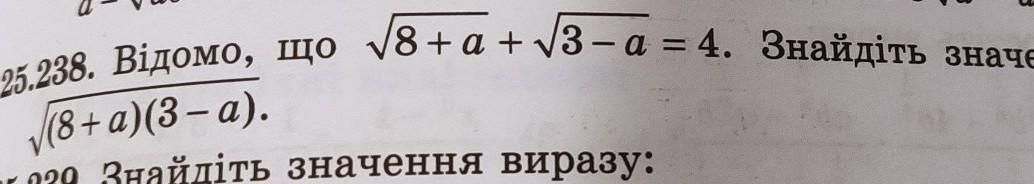 sqrt{8+a} +sqrt{3-a} =4\(sqrt{8+a} +sqrt{3-a})^{2}  =4^{2} \8+a+2*sqrt{(8+a)(3-a)} +3-a=16\11+2*sqrt{(8+a)(3-a)}=16\2*sqrt{(8+a)(3-a)}=5|:2\sqrt{(8+a)(3-a)}=2,5.