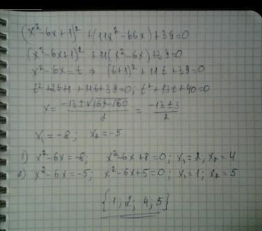 а) (х^2 – 6х + 1)^2 + 11х^2 – 66х + 39 = 0