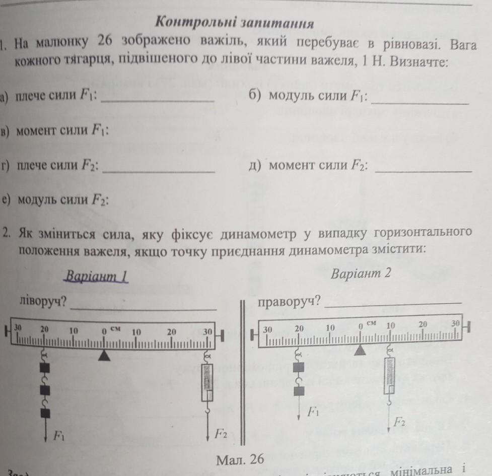 Срочно!!!! Даю 15 балов!!! На малюнку 26 зображено важіль, який перебуває в рівновазі. Вага
