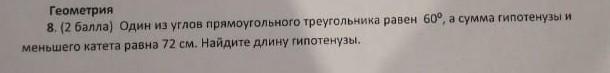 напротив какого-то угла (А) и лежит меньший катет (например, ВС), а ВС + АВ = 72 см. АВ - гипотенуза.