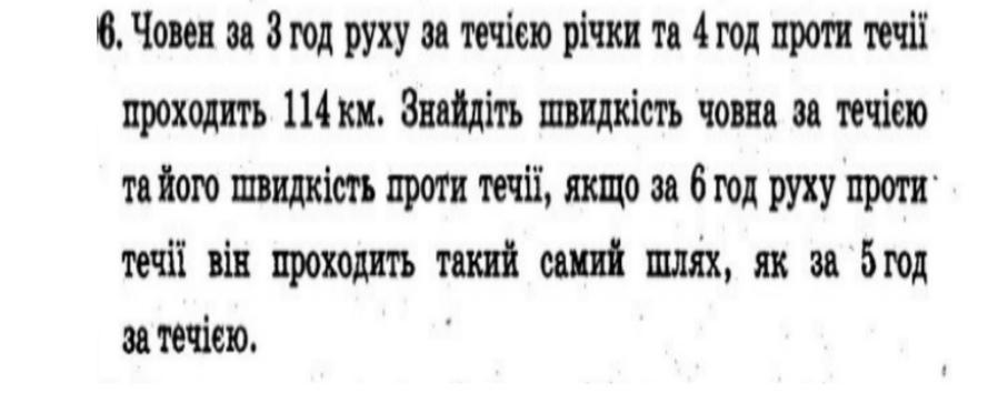 Лодка за 3 часа движения по течению реки и 4 часа против течения проходит 114 км. Найдите скорость лодки по течению и её скорость против течения, если за 6 часов движения против течения она проходит такой же путь, как за 5 часов за течением.