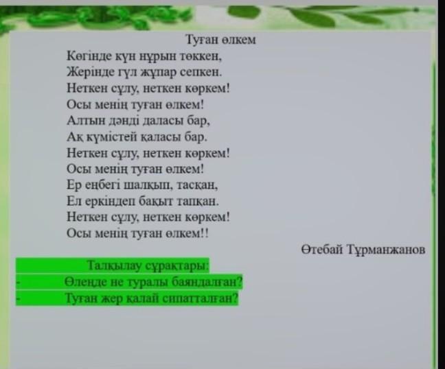 2)Туған жер-оттан да ыстық болғандықтан, жерінің көркемдігі мен сұлулығы, алтын дәнді даласы мен ақ күмістей көркем қалаларын мысалға алып, туған жерін көркем сипаттады.