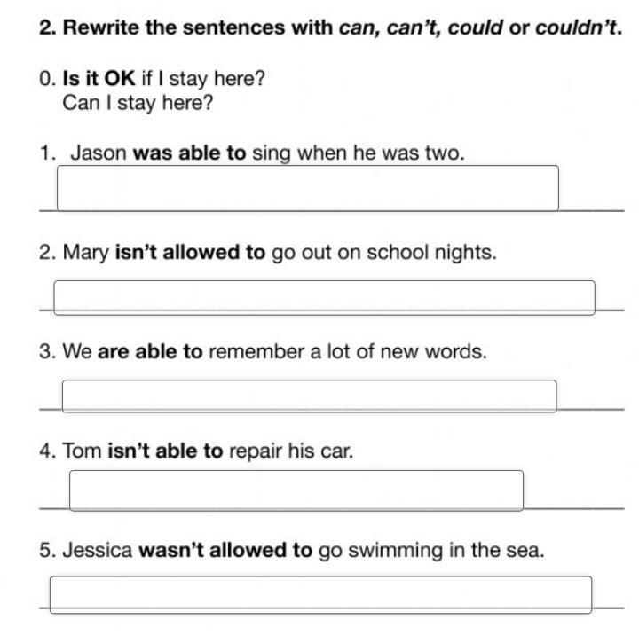 1could sing 2 can't go out 3 can remember 4 can't repair 5 couldn't go swimming