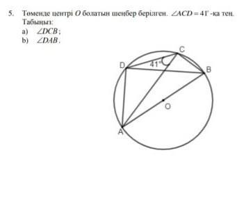 Ниже приведен круг с центром О. Угол ACD составляет 41°. Найдите угол DCB и угол DAB.Пожалуйста помагите