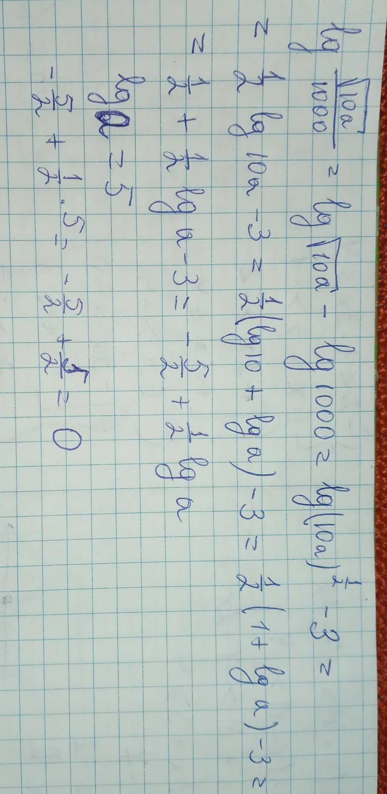 lg √(10*10⁵)/1000 = lg √10⁶/10³ = lg 10³/10³ = lg 1 = 0