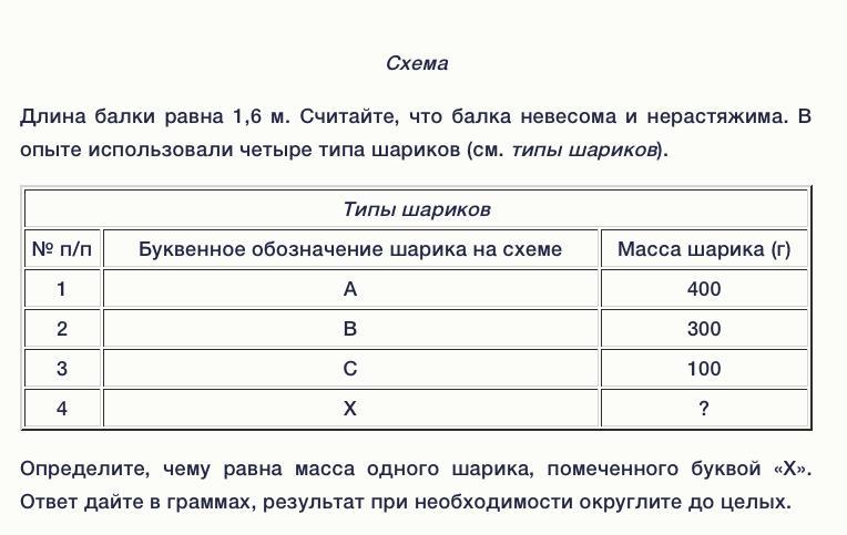 Длина балки равна 1,6 м. Считайте, что балка невесома и нерастяжима. В опыте использовали четыре типа шариков (см. типы шариков).