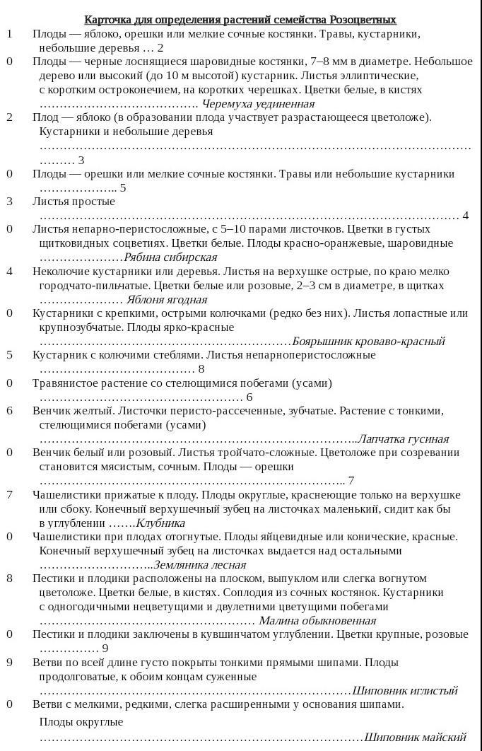 Это называется определитель, здесь описываются признаки растения, по которым можно опознать вид. Ты читаешь первый предложенный вариант, под цифрой 1, если он тебе подходит, то есть признаки растения подошли, то далее ты идешь на цифру 2, которая указана после точек. Если тебе не подошла 1 цифра, то альтернатива ей - цифра 0. Если она подошла по описанию, то твой вид - Черемуха уединенная. И так далее, идешь по карточке, пока не уткнешься в вид