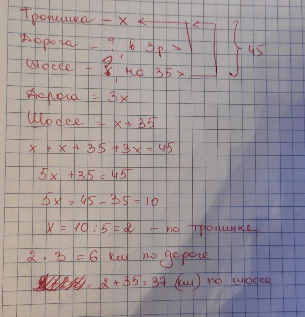 Велосипедист проехал 45 км. По проселочной дороге он проехал в 3 раза большее расстояние, чем по лесной тропинке, а по тропинке на 35 км меньше, чем по шоссе. Какой длины была каждая часть пути велосипедиста?Введите ответы в правильные ячейки