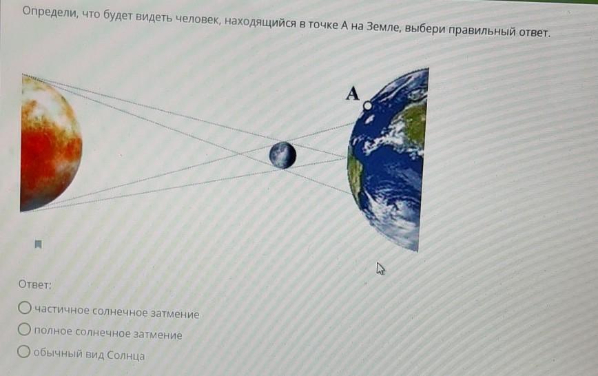 Определи, что будет видеть человек, находящиййся в точке А на Земле. Выбери правильный ответ.