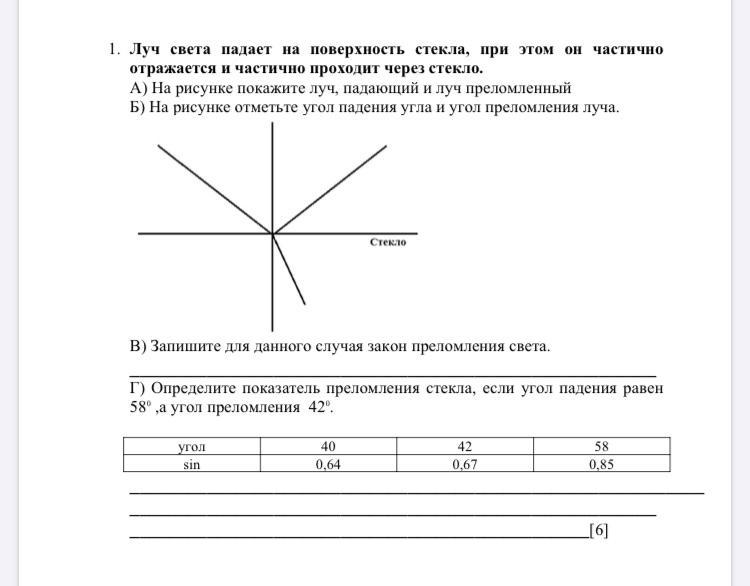 Луч света падает на поверхность стекла, при этом он частично отражается и частично проходит через стекло.