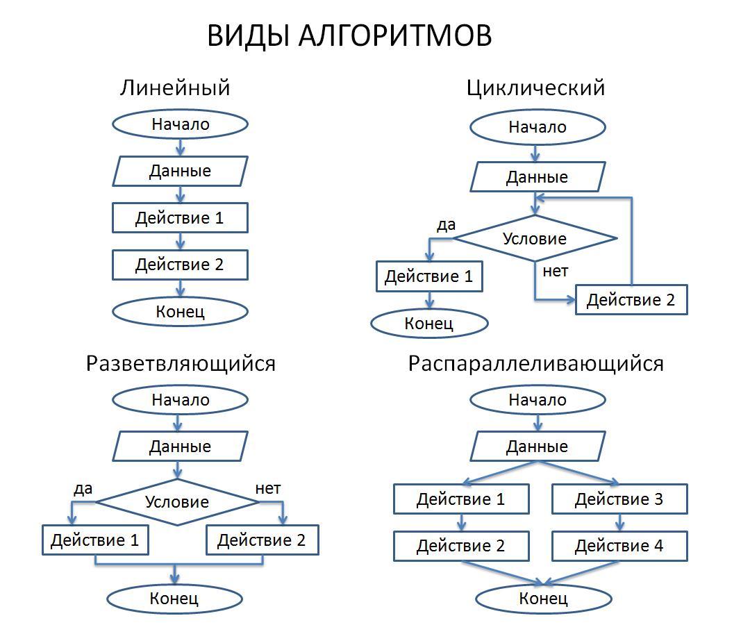основные: линейный, разветвляющийся и циклический. О распараллеливающемся никогда не слышала, его можно исключить.