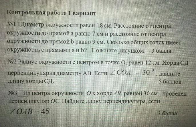 Диаметр окружности равен 18см.Расстояние от центра окружности до прямой а равна 7 м и расстояние от центра окружности до прямой b равна 9 см.Сколько общих точек имеет с прямыми а и b?Поясните рисунком.СРОЧНООО ПОМОГИТЕ 7 КЛАСС СОР 1 ПО ГЕОМЕТРИЙ,4 ЧЕТВЕРТЬ.