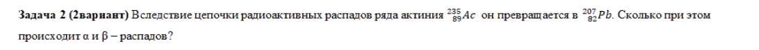 Вследствие цепочки радиоактивных распадов ряда актиния 89235 он превращается в 82207. Сколько при этом происходит α и β – распадов?