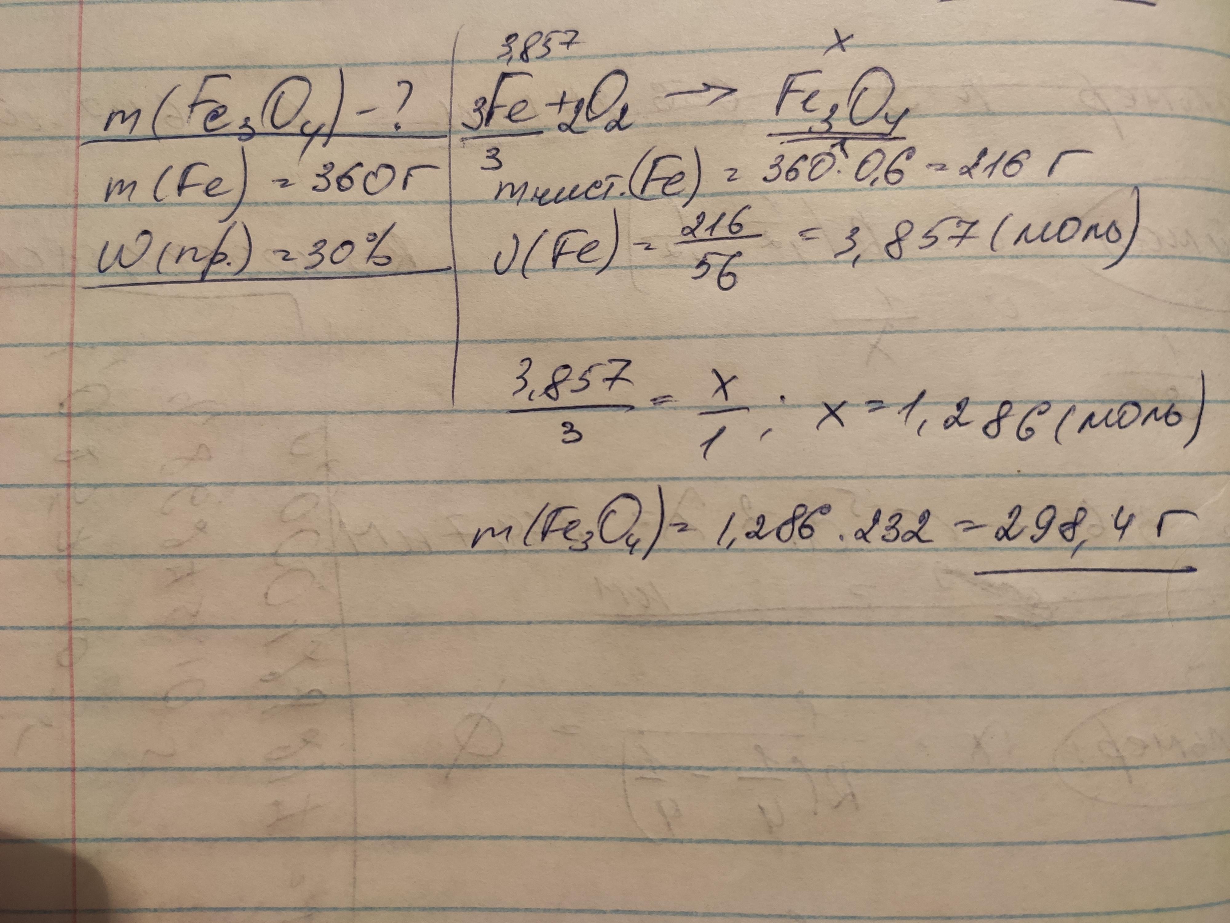 Вычислите массу железной окалины, которая образуется при сжигании порошка железа массой 360 грамм, содержащего 30% примесей.